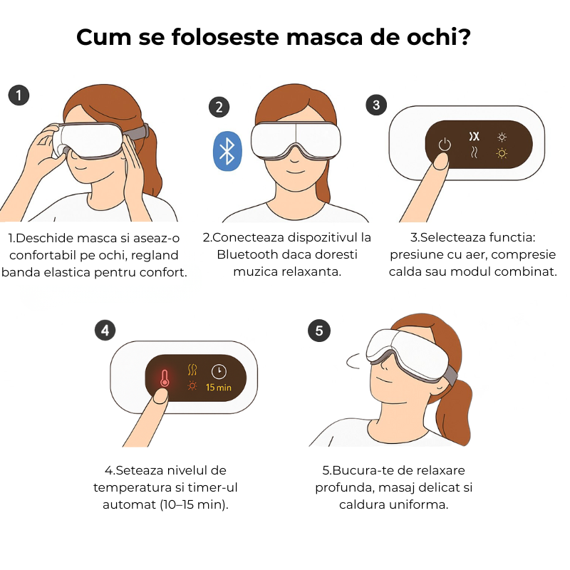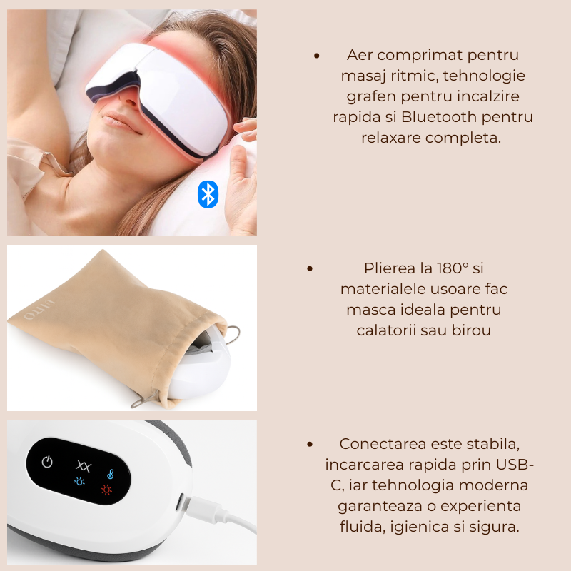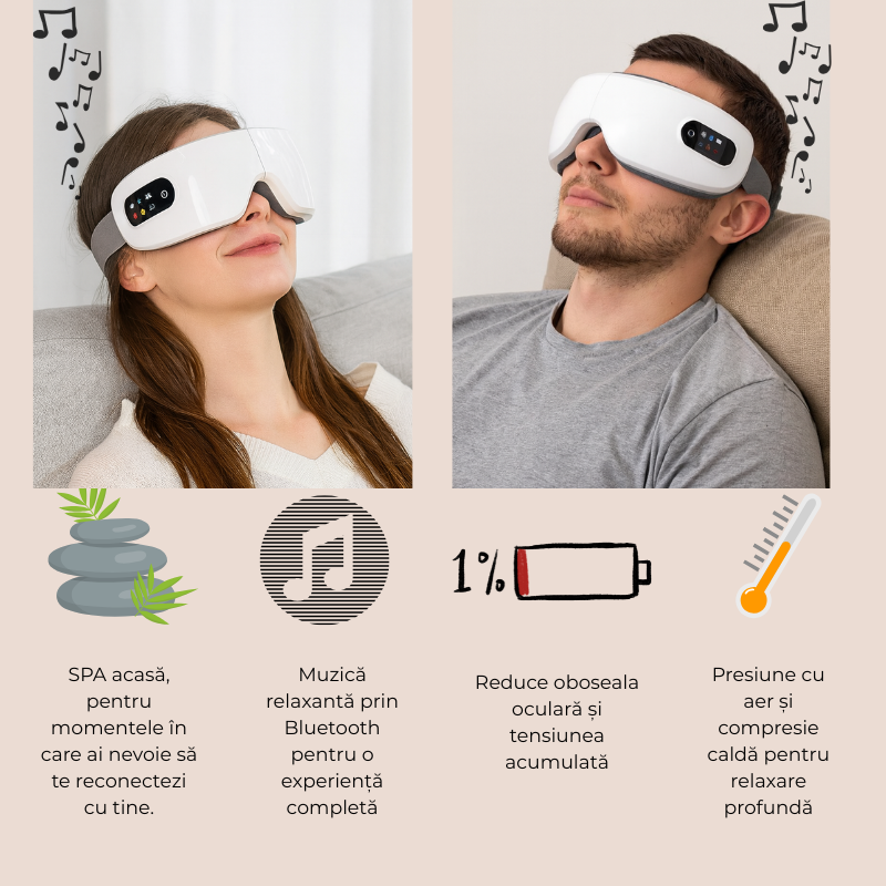 Aceasta masca combina caldura, presiunea cu aer si muzica pentru a crea un efect real de SPA la tine acasa. Este portabila, pliabila, usoara si perfecta pentru relaxare dupa ore la birou, lectii, condus sau utilizarea excesiva a telefonului. O alegere excelenta pentru confort, sanatate si stare de bine zilnica.