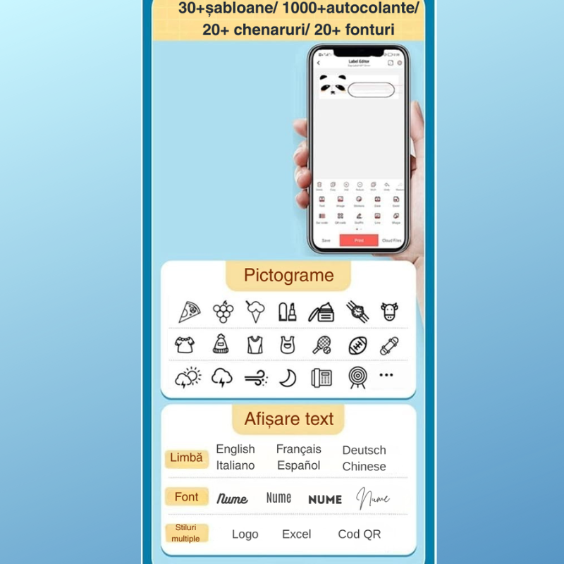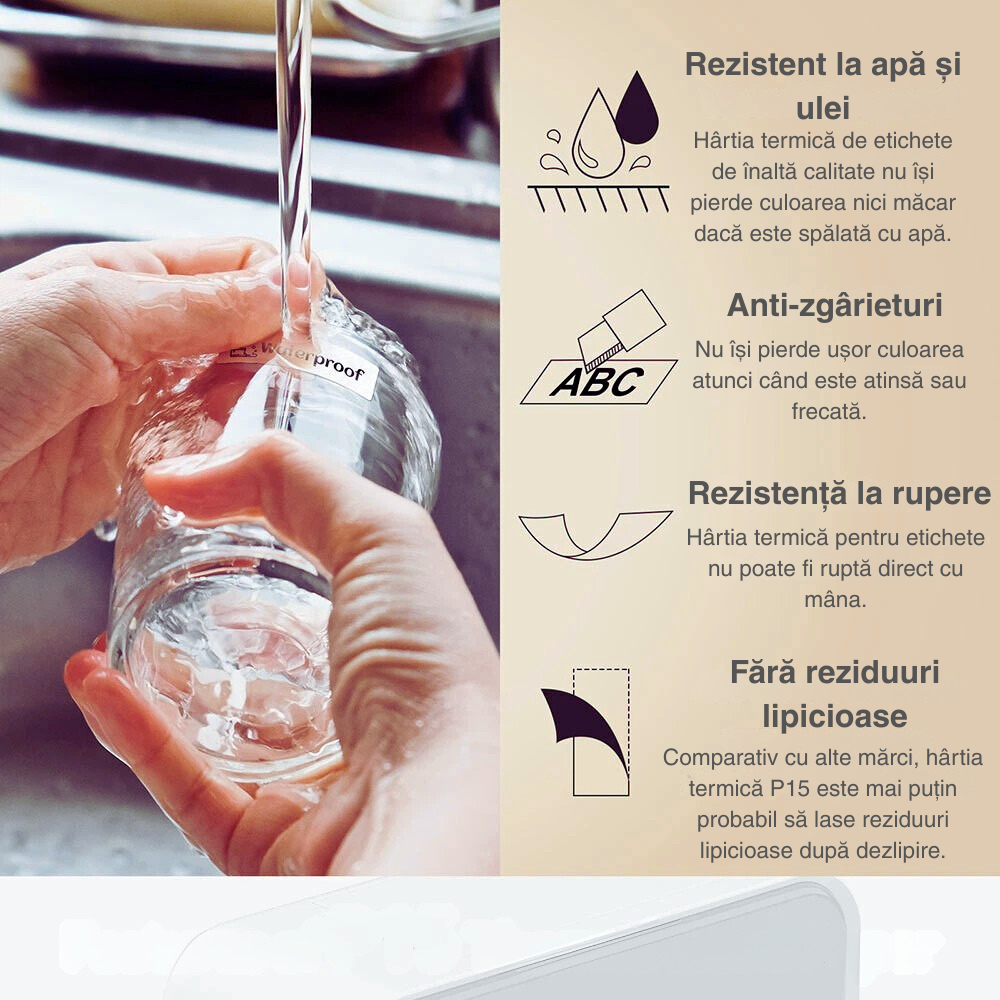 Imprimanta este optimizata pentru role de etichete termice cu latimea de 15mm, ideale pentru preturi, nume sau organizare.