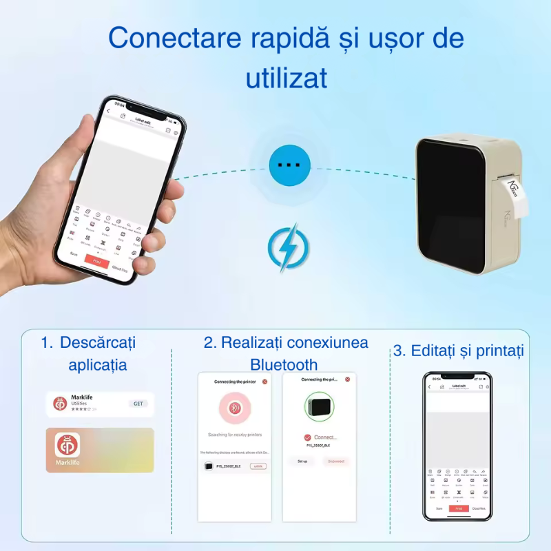 Aceasta imprimanta utilizeaza tehnologia termica fara cerneala, fiind compatibila cu iOS si Android prin conexiune Bluetooth stabila.