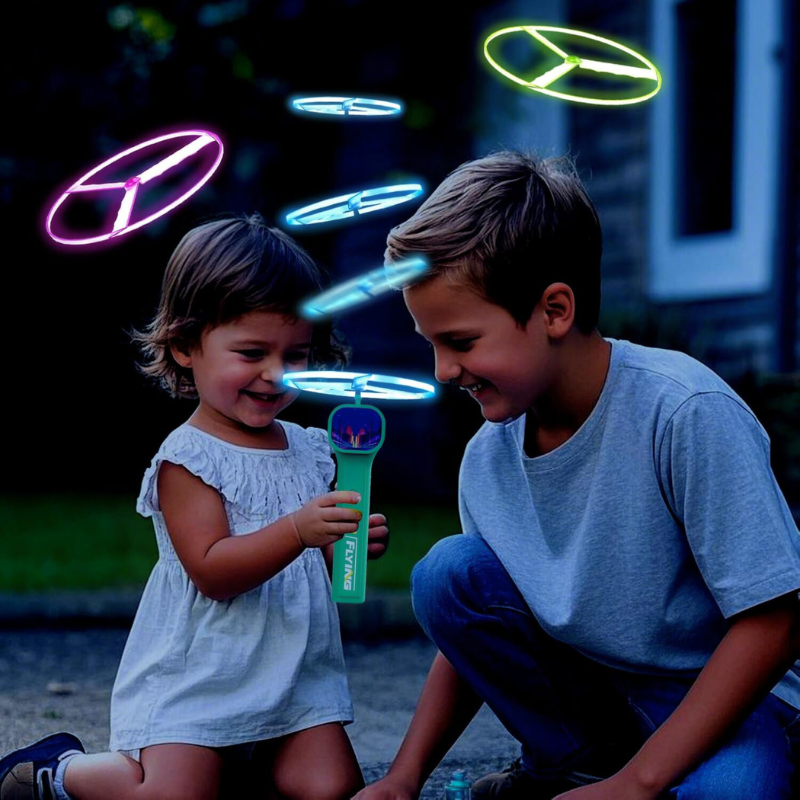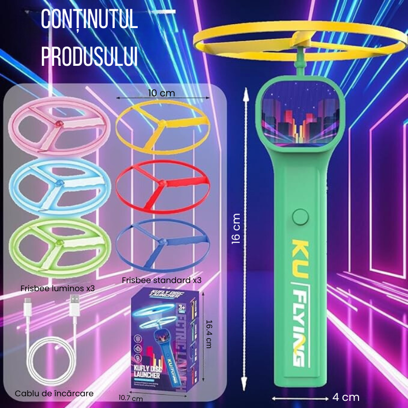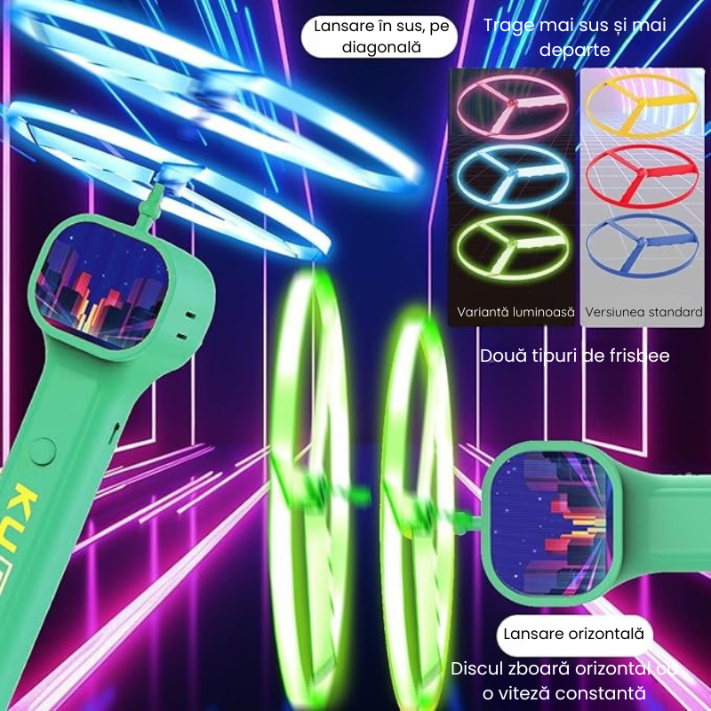 Selectati modul de lumina pe lansator, tineti butonul apasat 4-5 secunde pentru a incarca vizual discul fluorescent, apoi eliberati pentru un zbor spectaculos pe timp de noapte.
